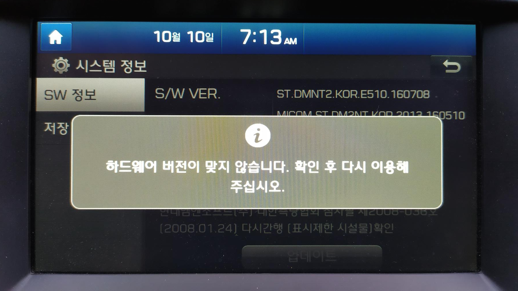 하드웨어 버전이 틀리다고 메세지를 토해낸다. ㅠ ㅠ (출근 운행시 업그레이드 하려고 저녁에 준비해 두었었다)