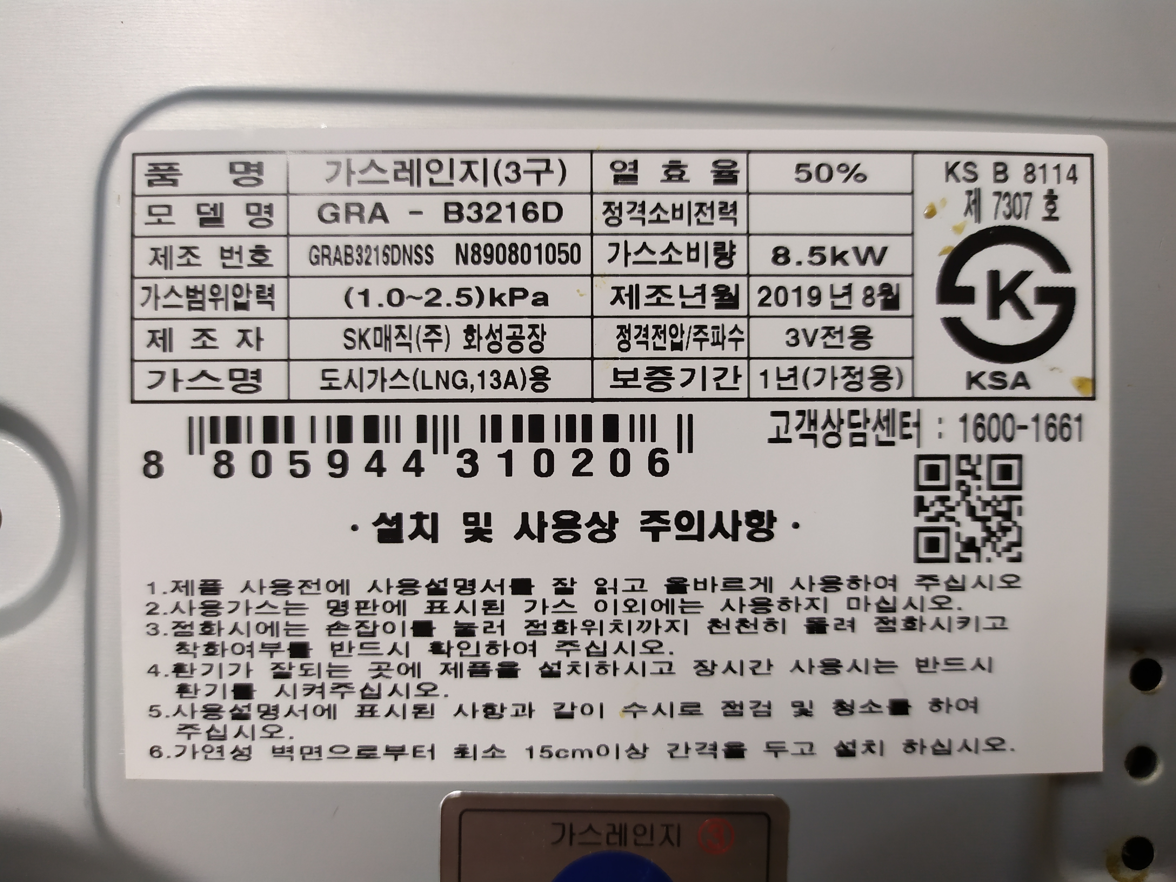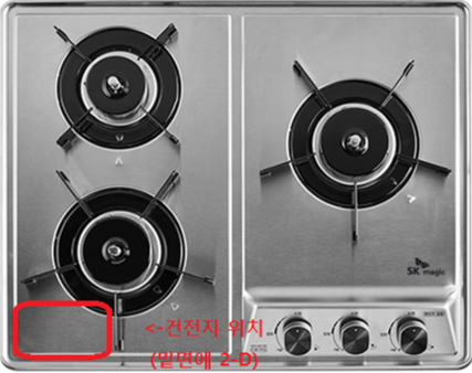 SK매직 GRA-B3216D 가스레인지 건전지의 위치는 정면에서 봤을때(점화 손잡이 3개가 오른쪽에)