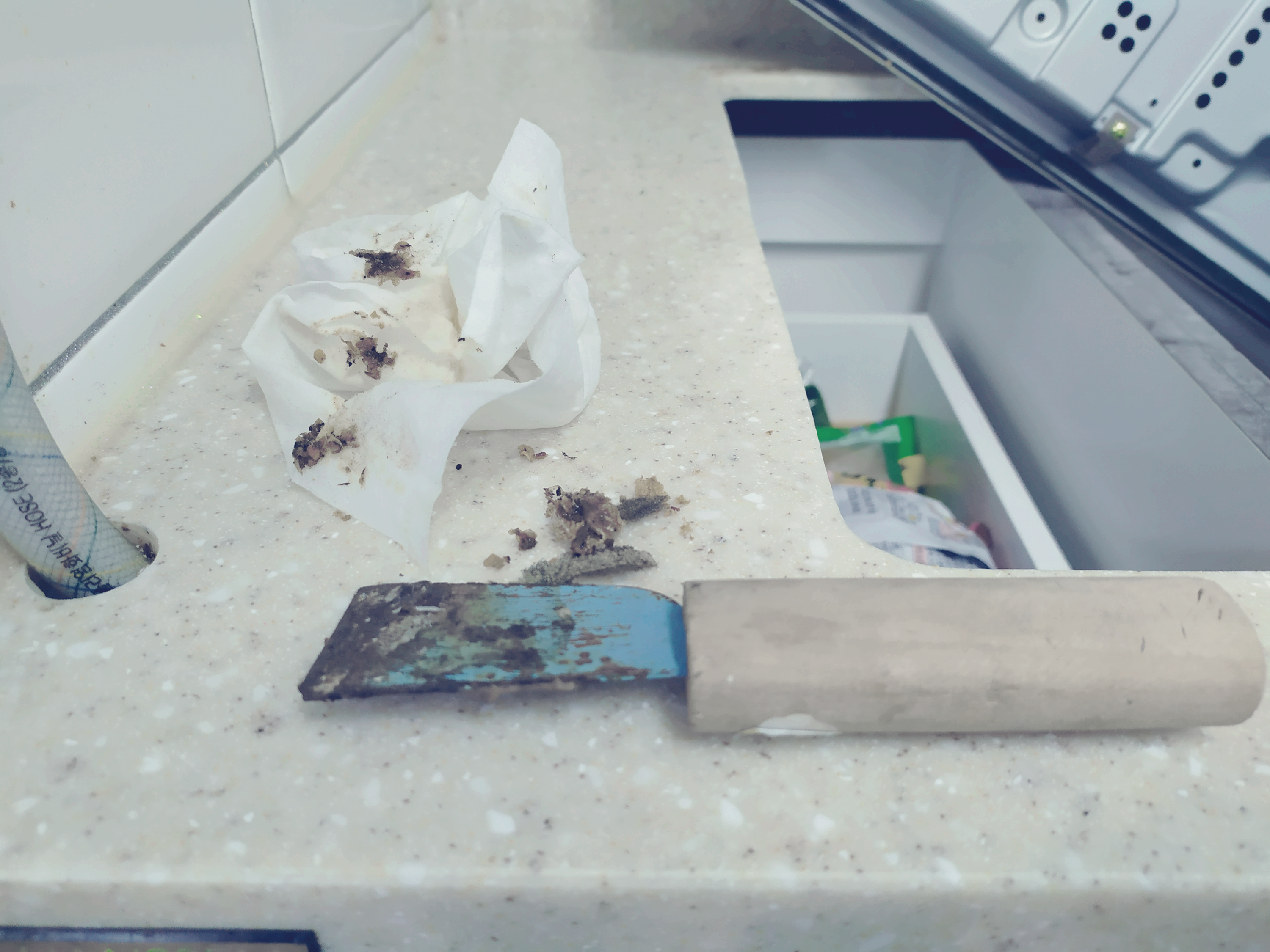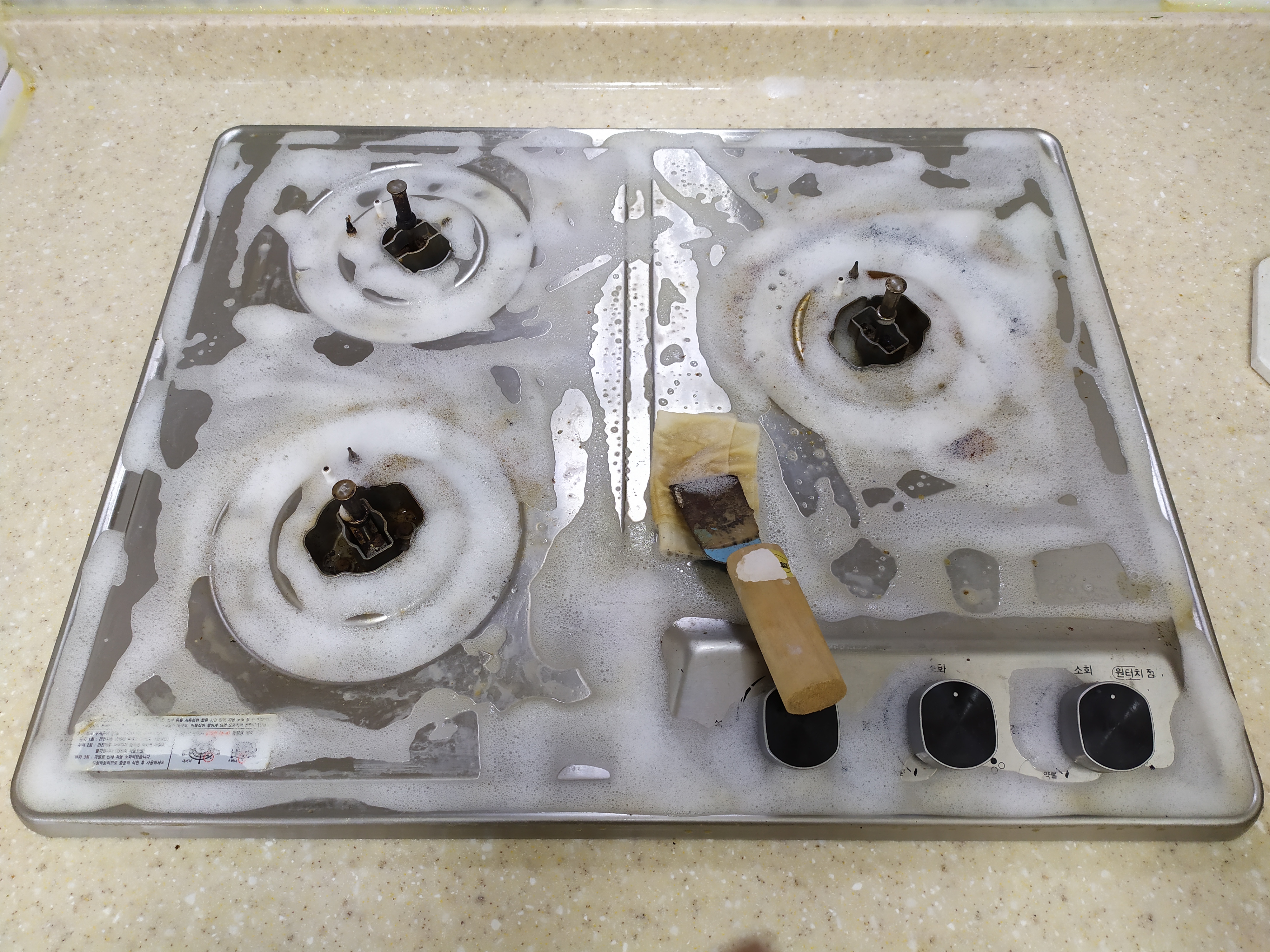주방에 보이는 온갖 세제를 동원하여 불렸습니다.