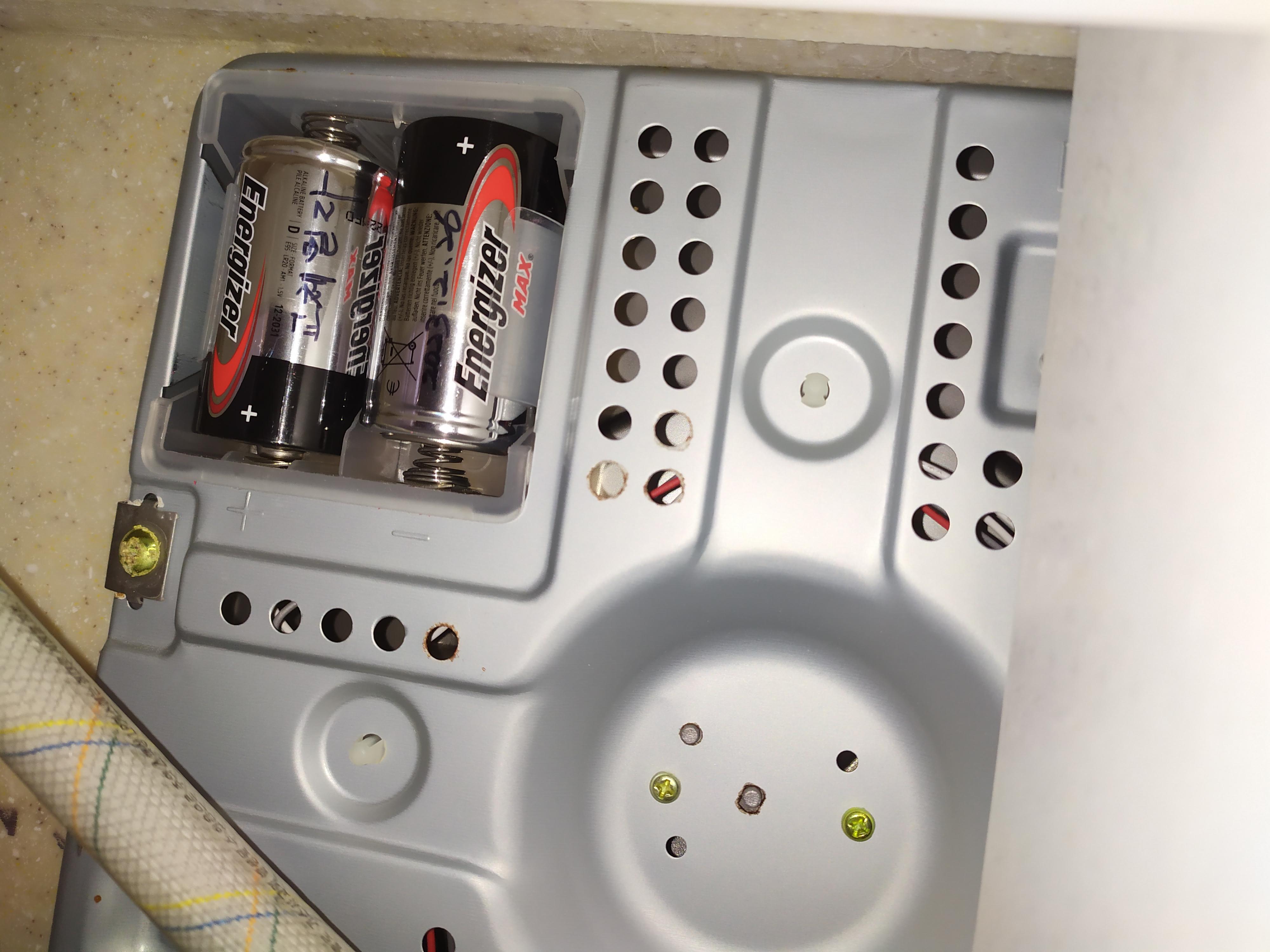 장애물이 없다면 서랍이나 싱크대 문을 열고 누워서 밑면을 보면 D-타입 건전지 2개가 나란히 보인다.