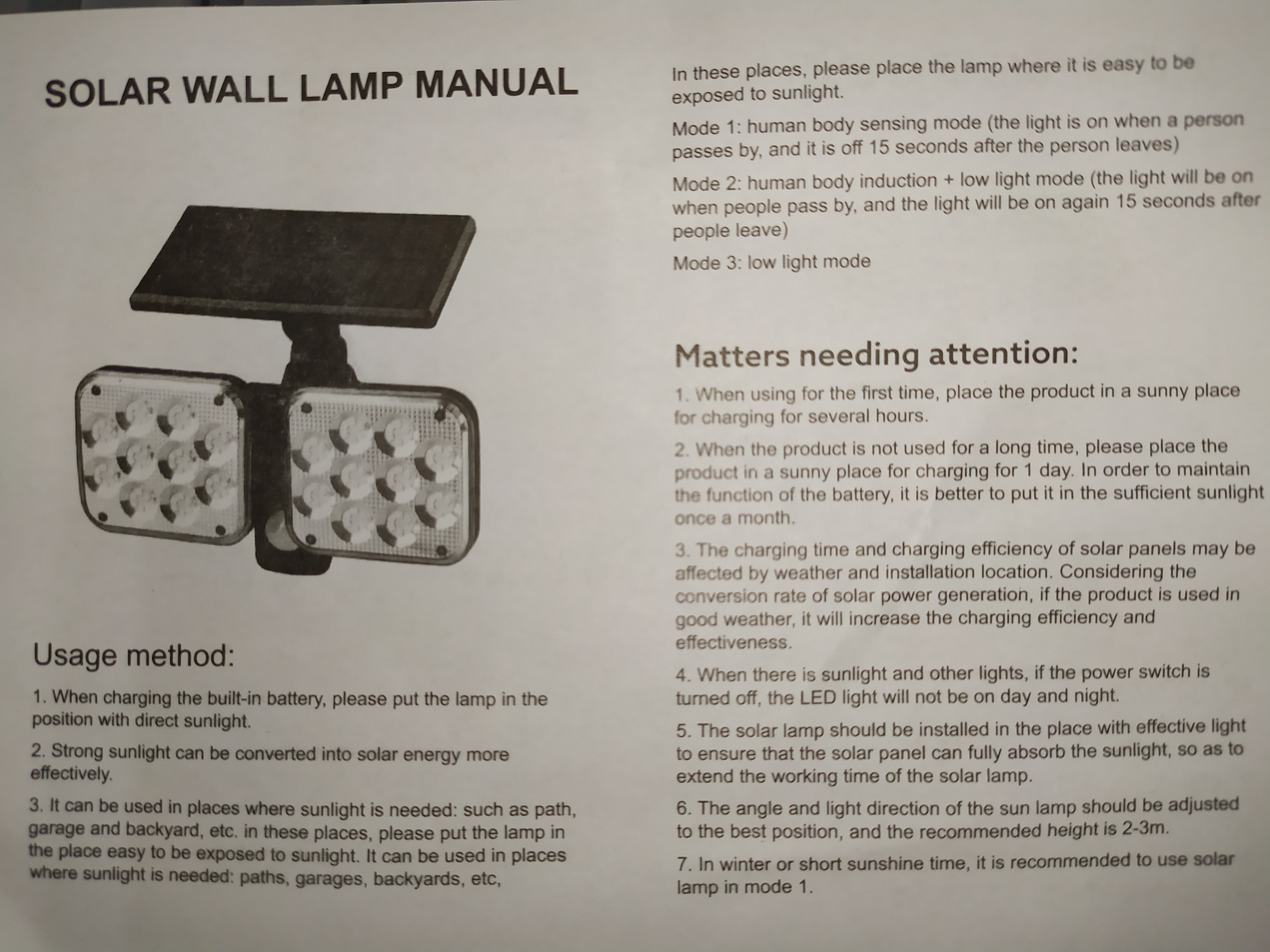 모드 1 (조명 밝기 대) : 아주 밝은 조명이며 센서 감지후 15초 정도 후에 소등되며