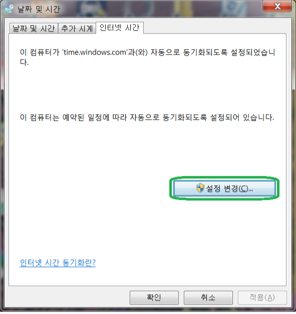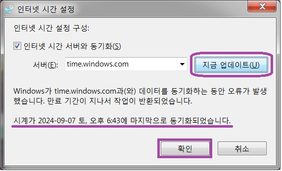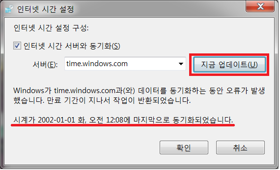 현재 인터넷 시간으로 동기화가 되었습니다. - 확인 - 클릭