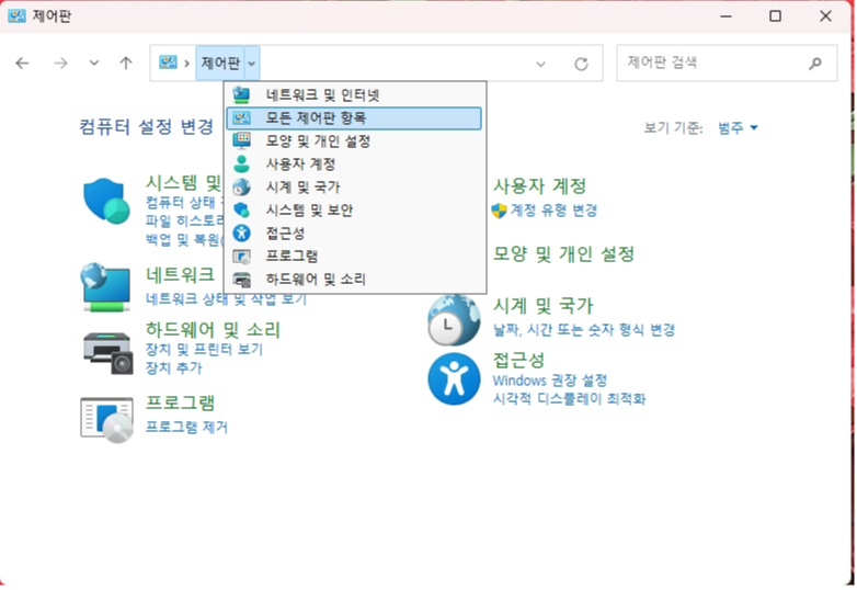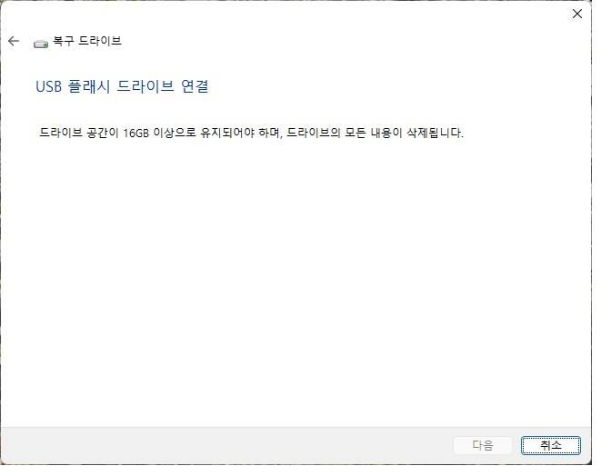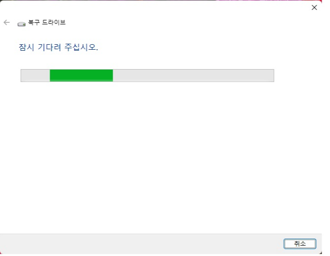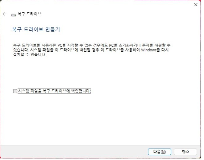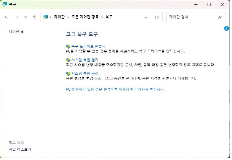 제어판 > 모든 제어판 항목 > 복구 > 복구 드라이버 만들기