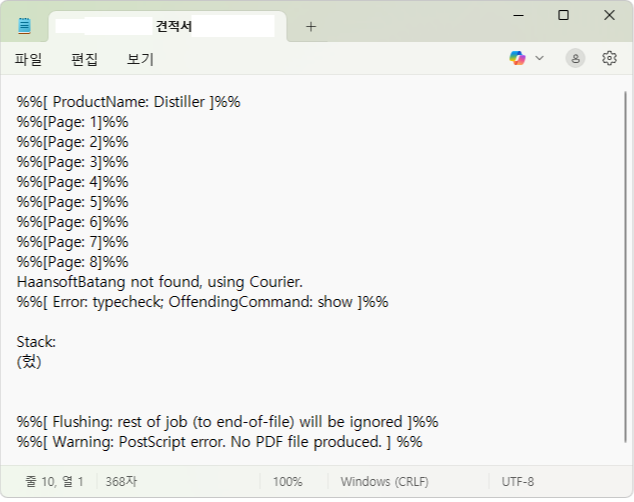 메모장 프로그램을 열어서 에러 메세지를 토하고는 PDF로 출력이 되지 않는다.